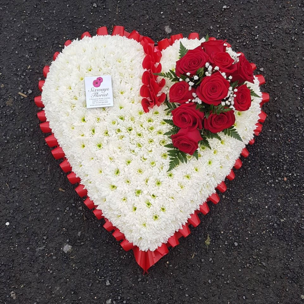 Large heart with red rose spray £150 size shown, 16", 18" or 21"
