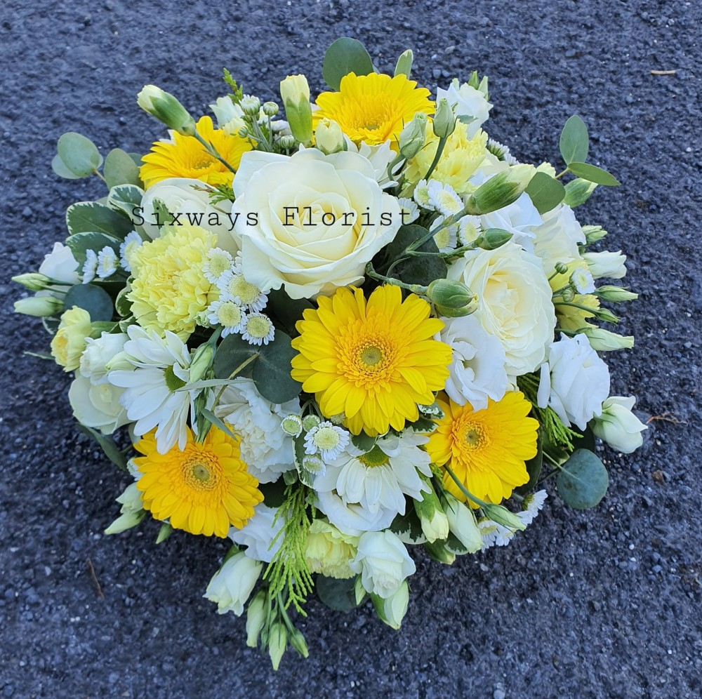 Funeral posy arrangement for a funeral the posy is a round quite natural design not too structured this one is in shades of lemons to yellow with white flowers may vary but this one contains germini roses carnations chrysanthemums with mixed foliage please state if there are flowers you do not want included. Please be aware we do need as much notice as possible to arrange funeral flowers I have added these to the website for viewing choices but please ring if youd like to discuss anything shop number is 01269 841840 but if need to ask something and not at the shop you can email sixwaysflorist@gmail.com We can deliver to all funeral directors in the locality please provide us with the following information of the deceased name time of funeral if known we dont like delivering to the house of bereaved family unless they are ordering as it may not be convenient for them and they also may not be home. Unfortunately at times we may be forced to make slight changes especially due to seasonal availability or quality or short notice but do try to stick as close to original design.