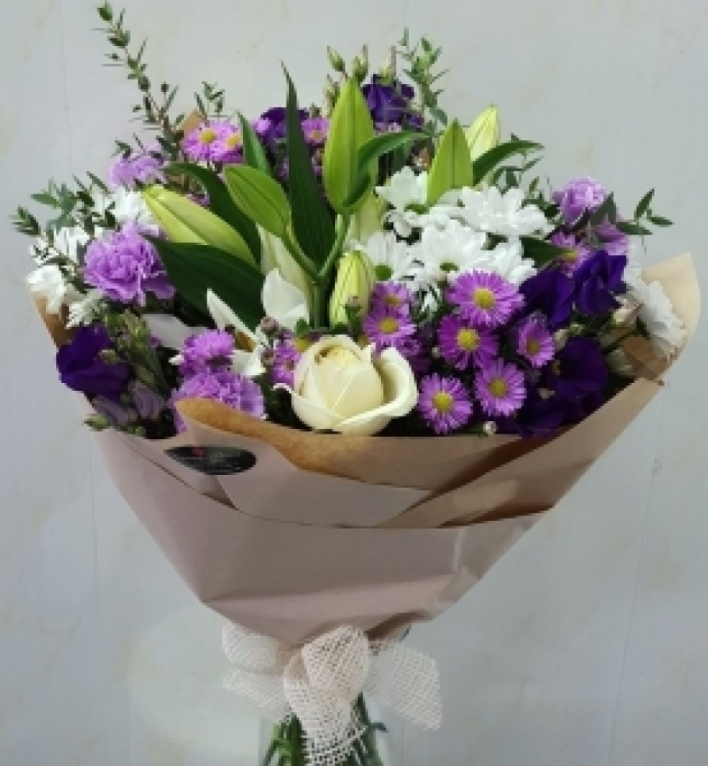 Striking purple and white selection inc lilies and roses n.b the pic is an example of one previously made we vary our stock so may vary but with be in those colours, if there are any varieties you prefer not to be used please let us know. Flowers will be tied in place and then wrapped in eco friendly wrapping which again may vary but will be in keeping with occasion and will match or complement the flowers. Three main prices have been added but you can go between those prices n.b the picture is larger than the standard size Mother's Day deliveries, you can choose from Wednesday,Thursday, Friday, Saturday or Sunday we would prefer more local on the Sunday so we can get round them quicker it may be best to choose an alternative day to the Sunday if the recipient is likely to go to out ie to Church/Chapel or lunch we advise opting for alternative day to Sunday as we are unable to promise timesor guarantee am or pm we will try to keep website open but when it gets closer we sometimes have to shut it down to keep an eye on stock levels on some items this maybe temporary measure please be understanding that this is our busiest time of the year, you can alternatively if you live locally order click and collect Thursday and Friday by 5.30pm Saturday please collect by 12noon, Sunday by 12 noon, n.b we may have to substitute some items but will try to use similar